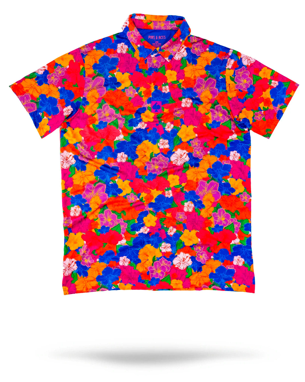 Men's Margaritaville Bama Breeze polo shirt featuring a vibrant tropical print with palm leaves and drink motifs.