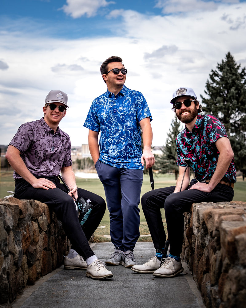 Seltzer sleeve attached to a golf bag, showcasing colorful designs while golfers play in the background on a sunny day.