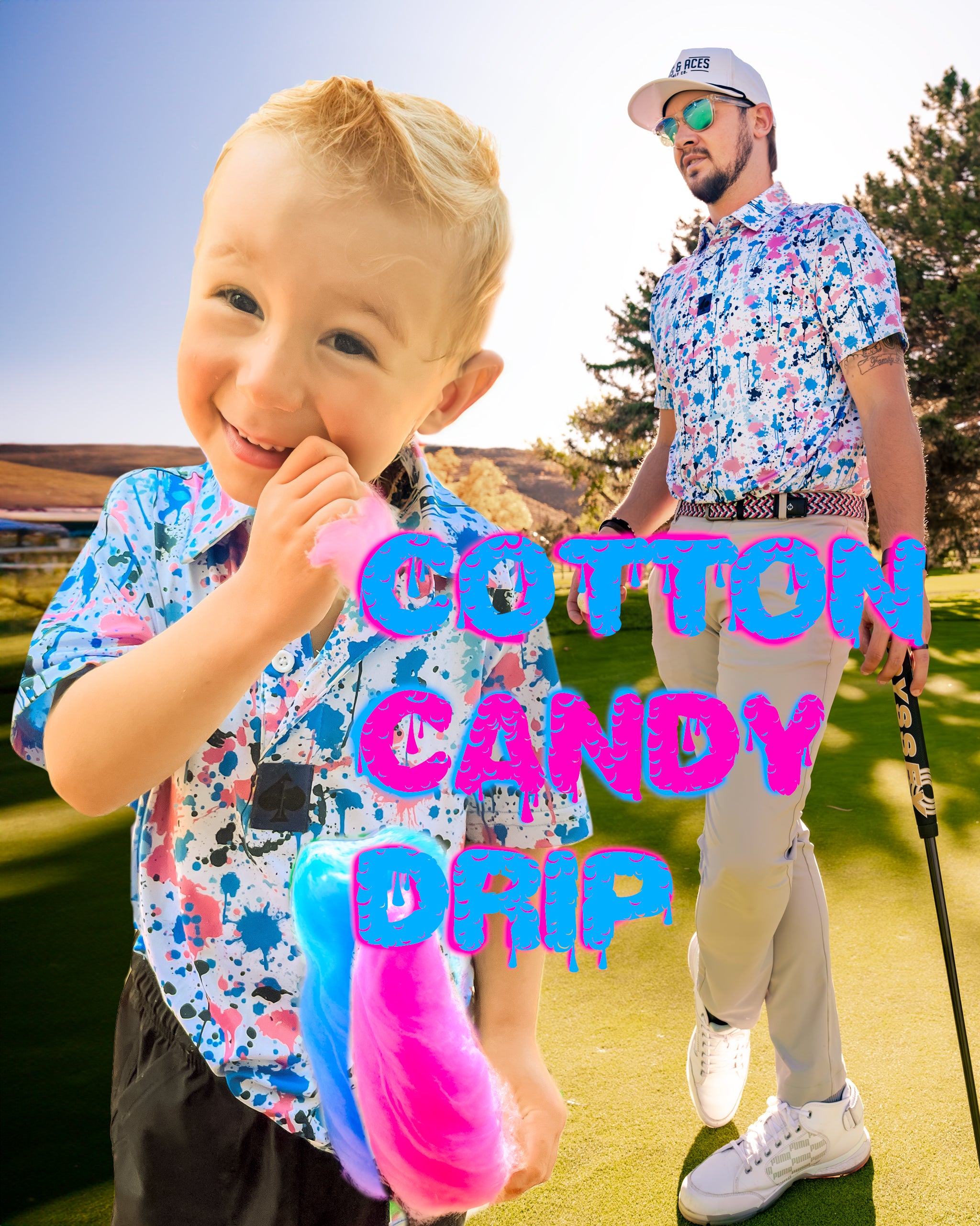 Youth Cotton Candy Drip Polo featuring a vibrant splatter design in pink and blue on a white background.