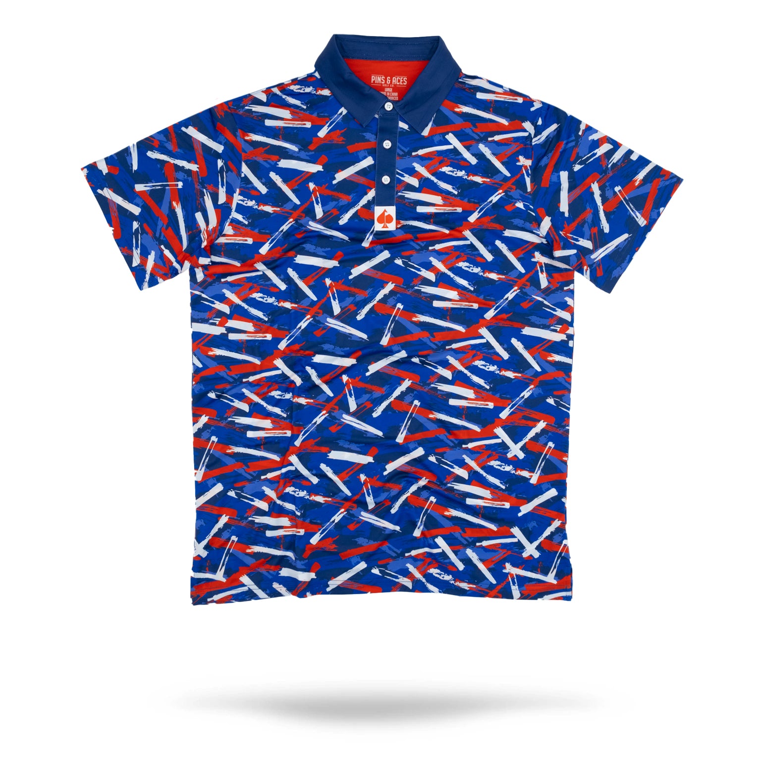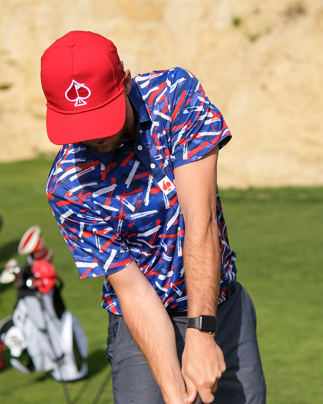 A man wearing a golf polo shirt designed with the American flag pattern, featuring stars on the blue field and red and white stripes.