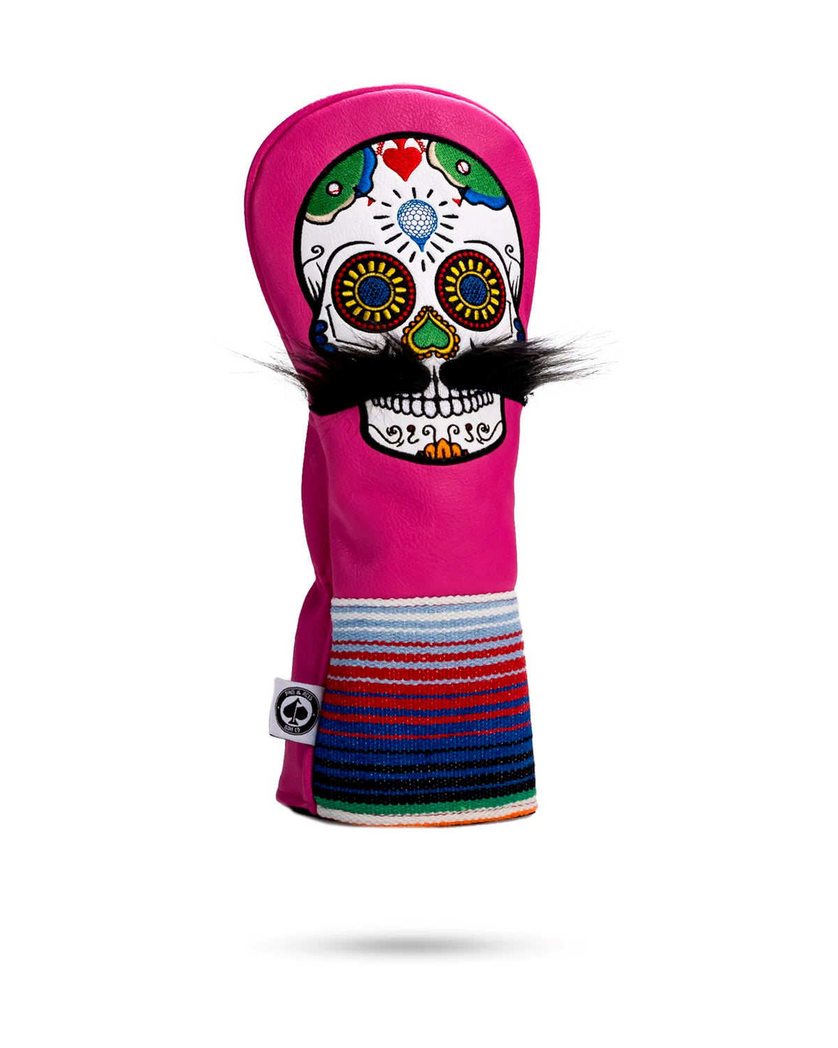Bold black putter cover featuring a colorful mustache sugar skull design, perfect for golfers seeking unique style on the course.