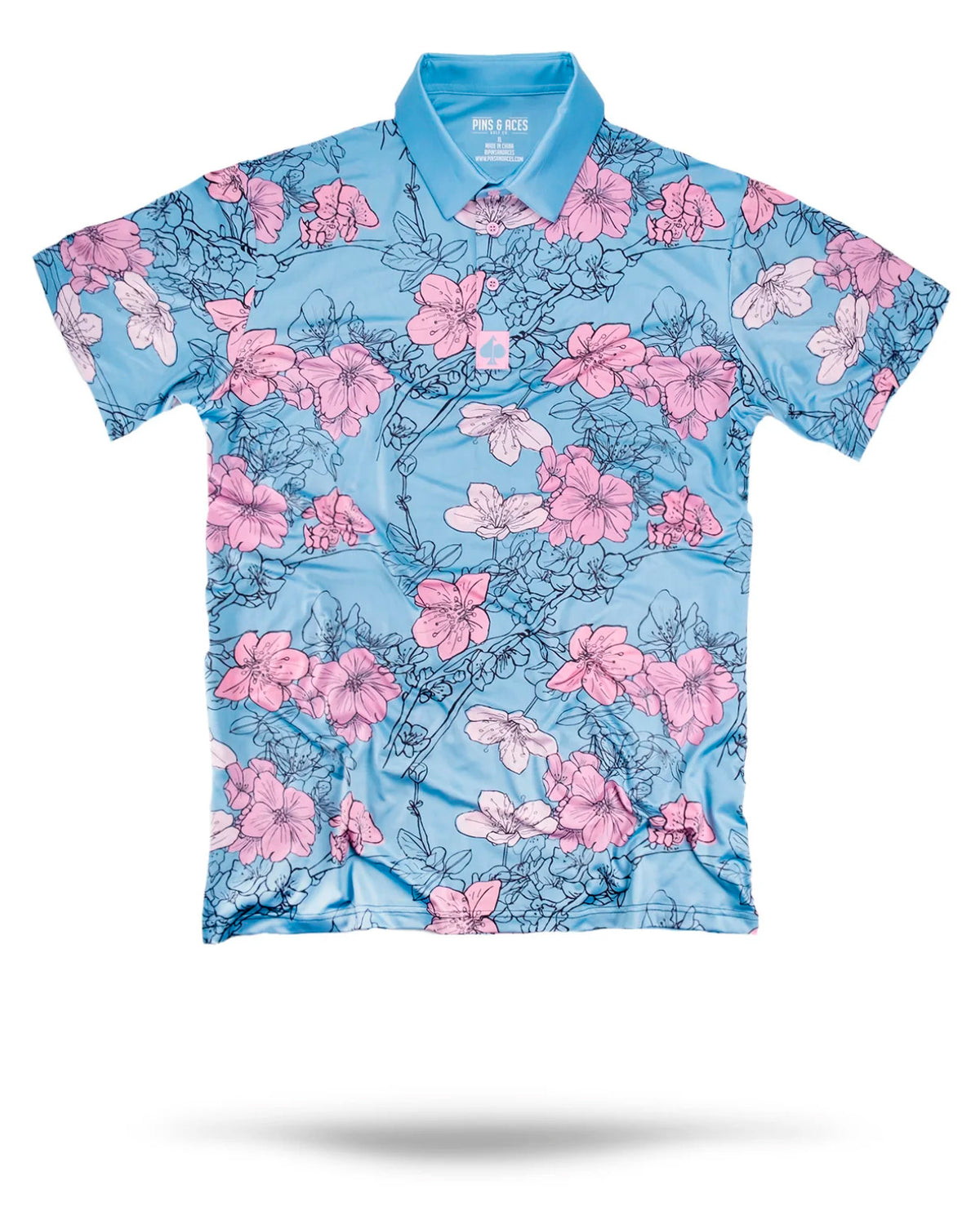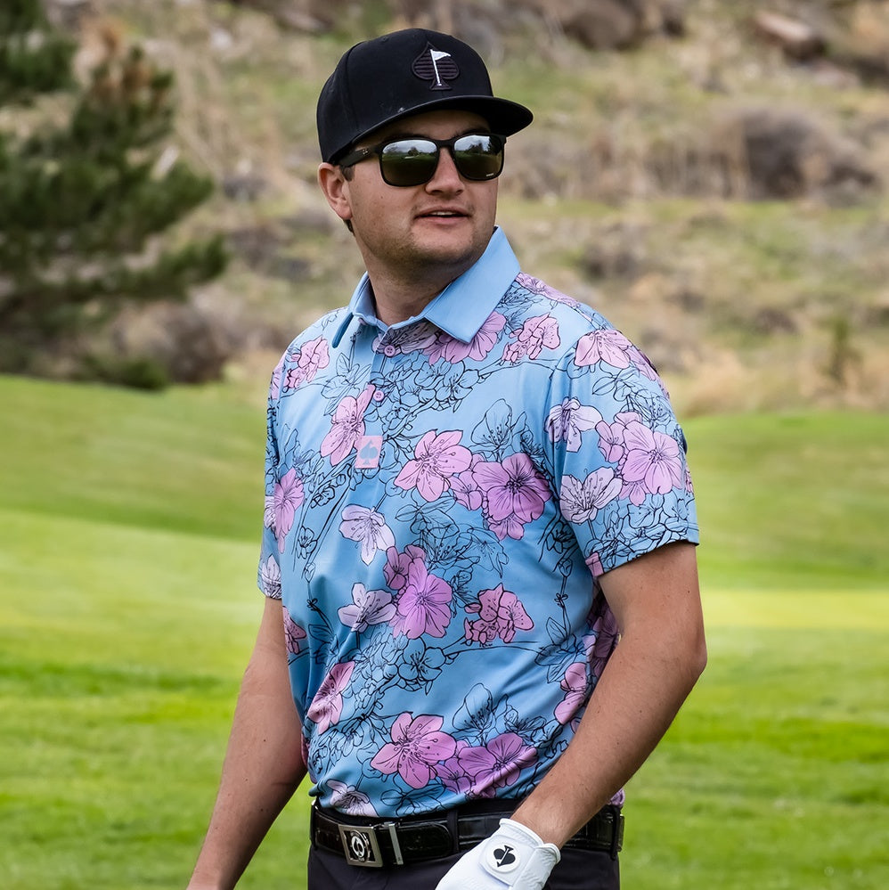 Cabo Colada men's polo shirt in vibrant turquoise with short sleeves, modeled outdoors.