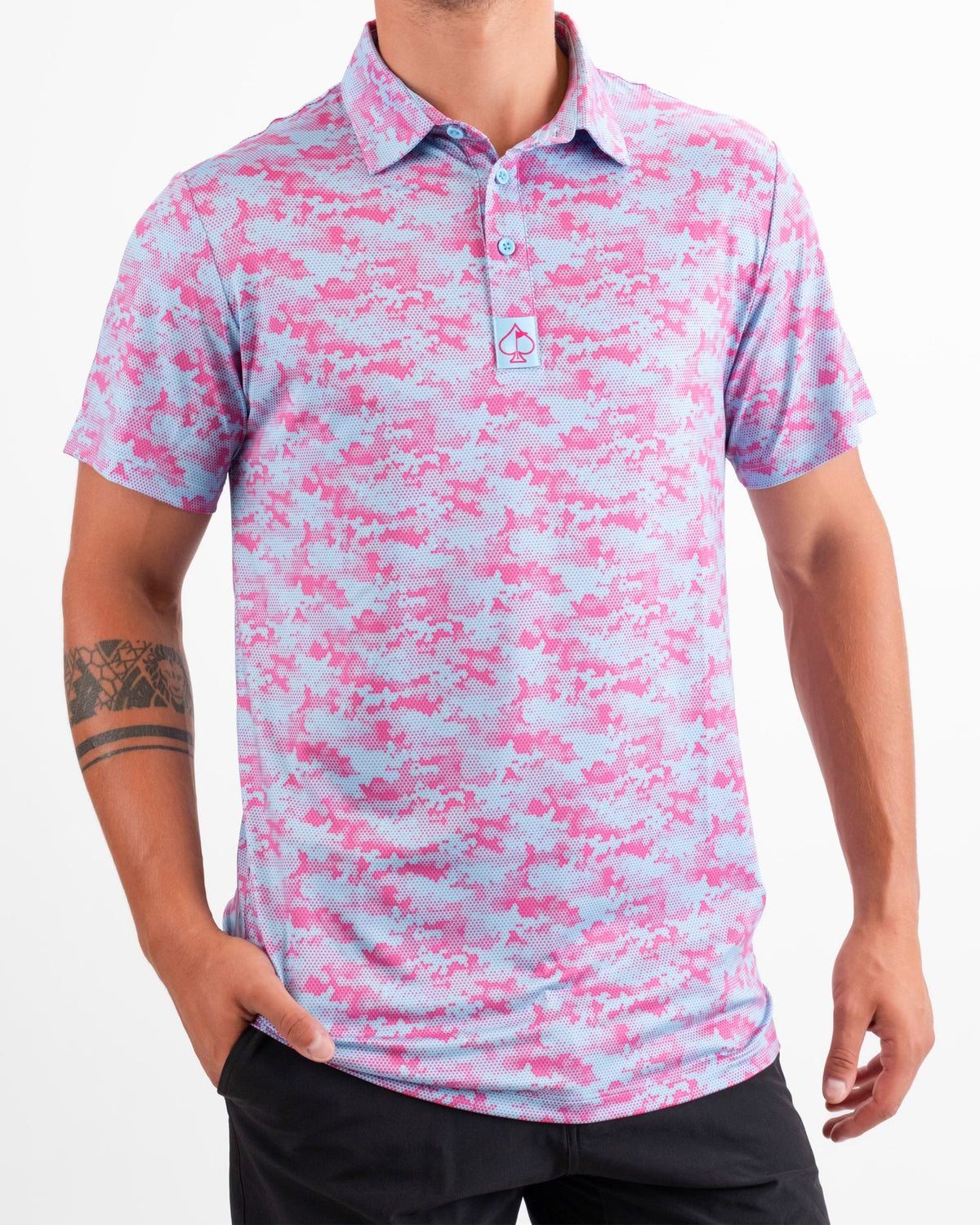 Golf bag with bold, graphic headcovers, and a portable drink dispenser for golfers who want to stand out on the course.