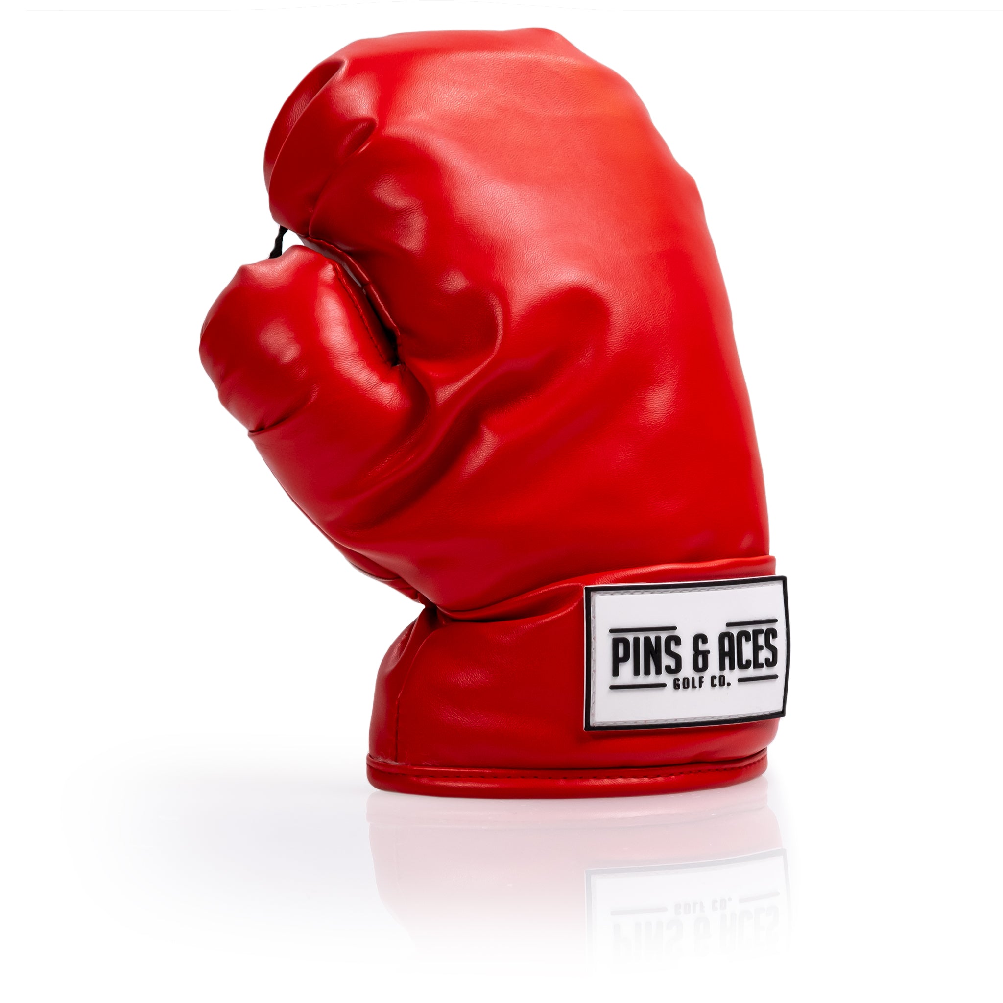 Bold red boxing glove driver cover with a sleek design and Pins & Aces Golf Co. branding for standout golf style.