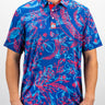 Cabo Colada Hawaiian polo shirt in blue and magenta with tropical print.