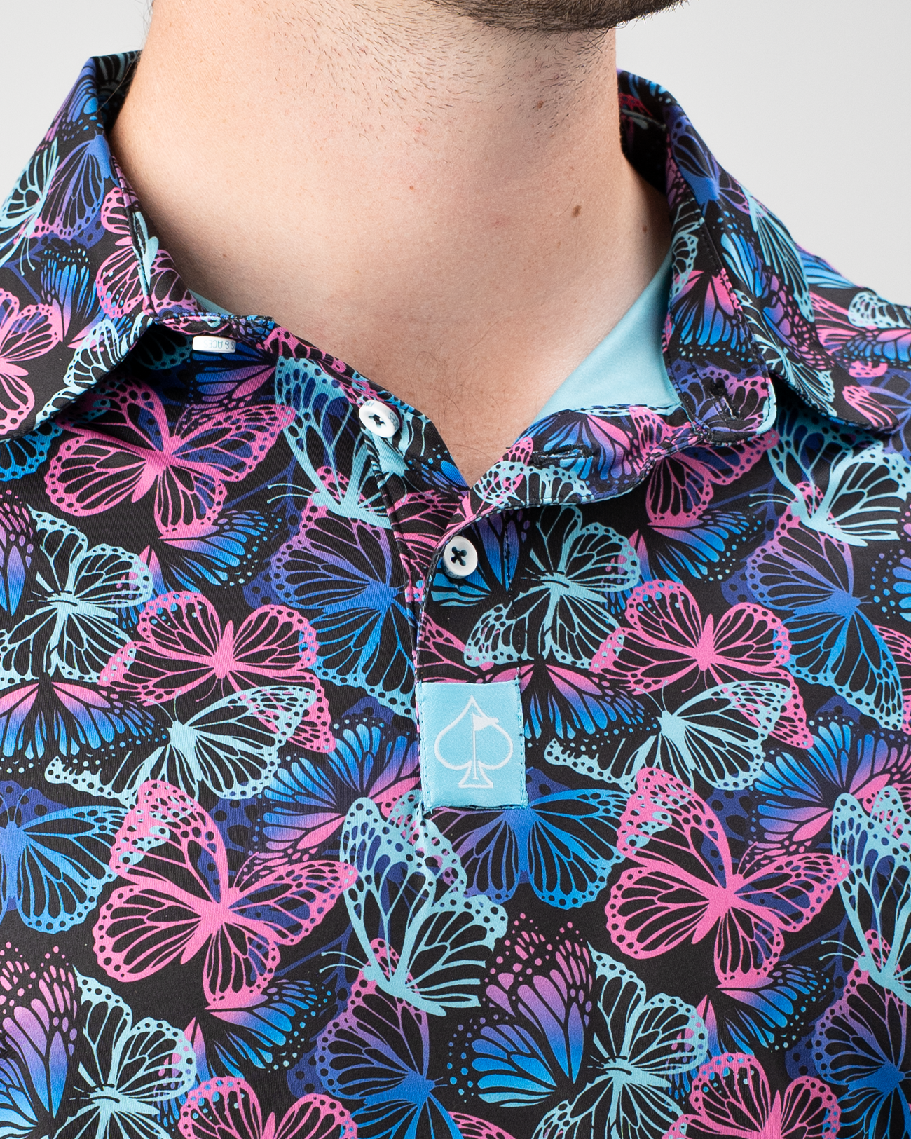 Men's electric butterfly polo shirt featuring a vibrant butterfly print in blue and pink, perfect for stylish golfers.