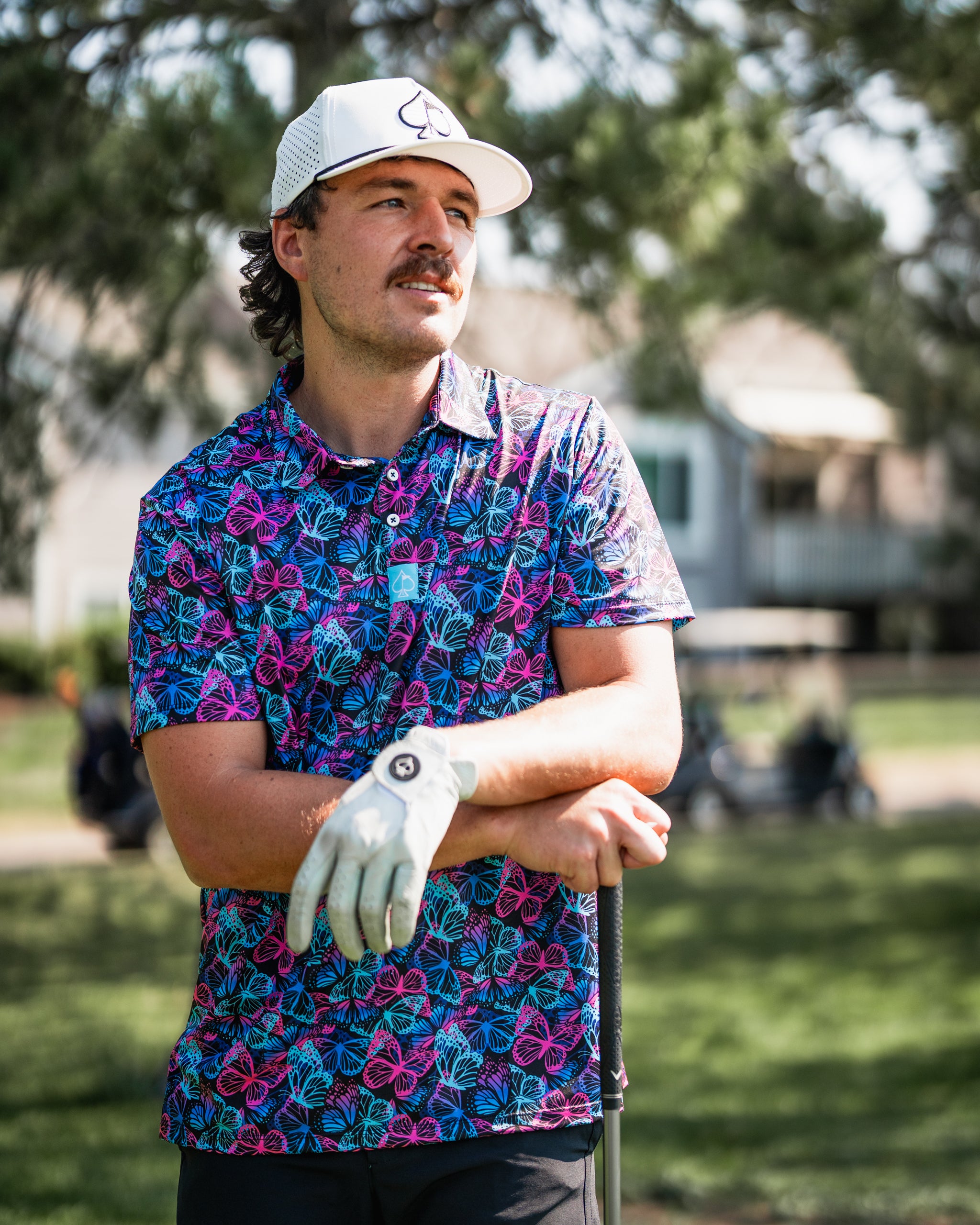 A golfer stands confidently on the course, wearing a vibrant Electric Butterfly polo shirt featuring a colorful butterfly pattern.