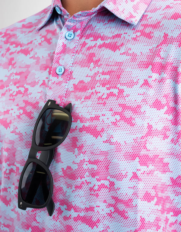 Youth electric camo patterned golf shirt with blue, teal, and navy camouflage print and a collar.