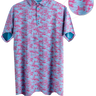 Young boy wearing a blue electric camo pattern polo shirt with short sleeves and a collar, smiling against a plain white background.