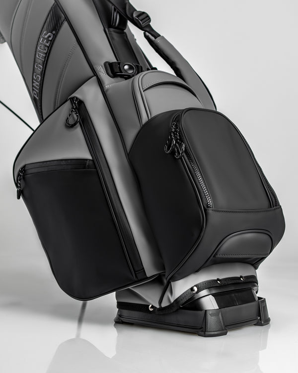 Close-up of the Player Preferred Golf Bag in Flat Ash, featuring a pocket with a golf rangefinder partially visible.