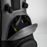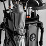 Close-up of golf accessories with a bold green and white canister secured in a pocket on a sleek golf cart.