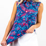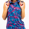 Stylish woman wearing a vibrant blue and pink floral sleeveless polo, holding sunglasses, perfect for golf outings.