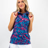 Brightly colored women's sleeveless golf polo featuring a floral pattern in blue and pink, designed for stylish performance on the course.
