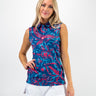 Stylish women's sleeveless golf top featuring a vibrant floral pattern in blue and pink, perfect for summer play.