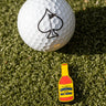 Louisiana Hot Sauce ball marker beside a golf ball with an ace of spades logo on a green turf background.