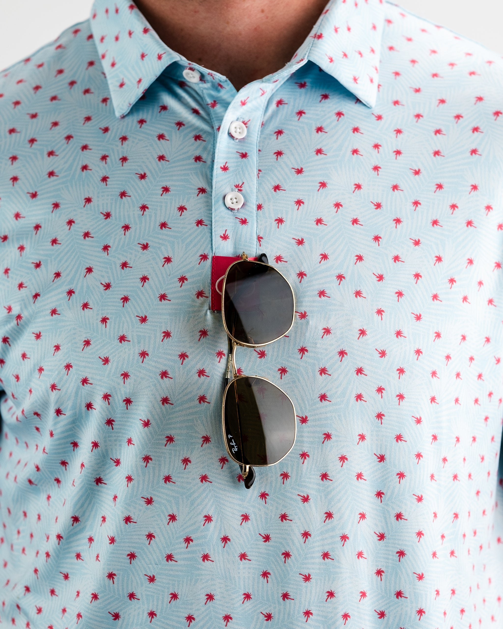 Light blue golf polo shirt featuring a vibrant palm tree pattern in pink, perfect for stylish golfers on the course.