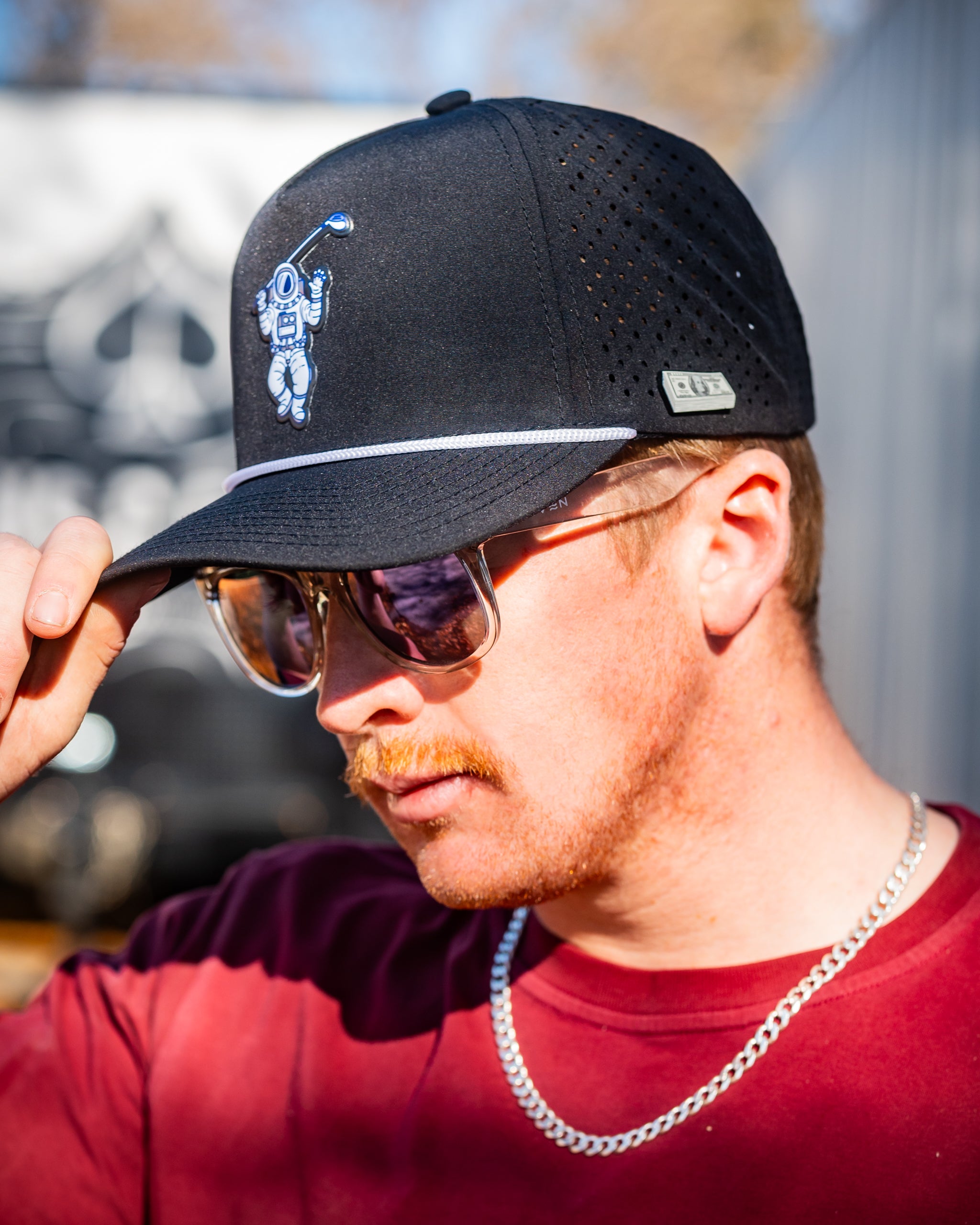 Black golf cap with a blue and white astronaut logo, perforated sides, and a white trim for bold golf style.