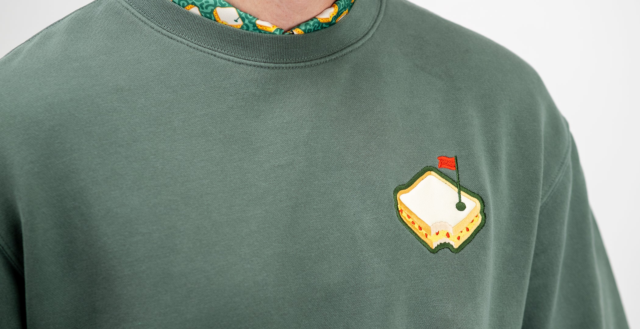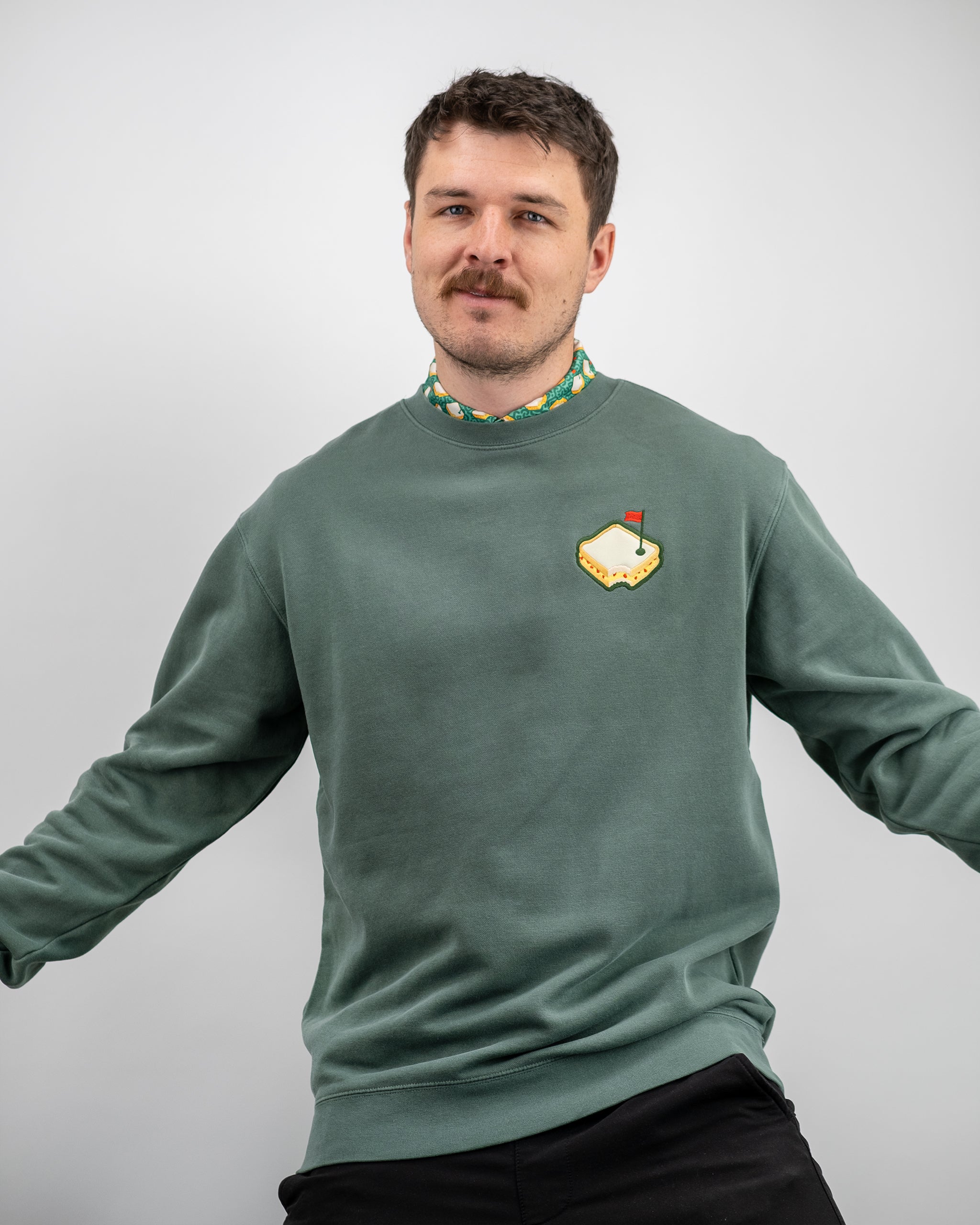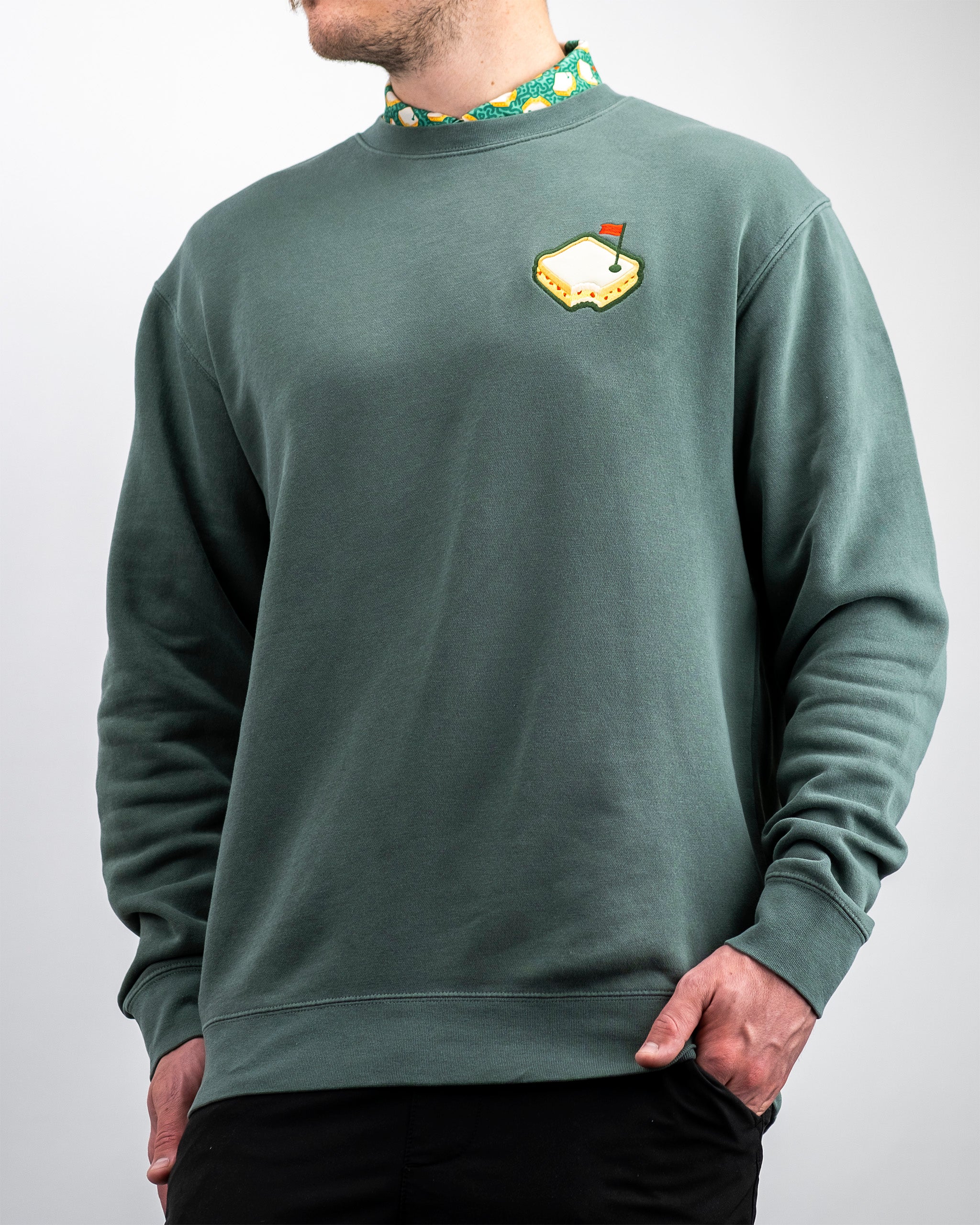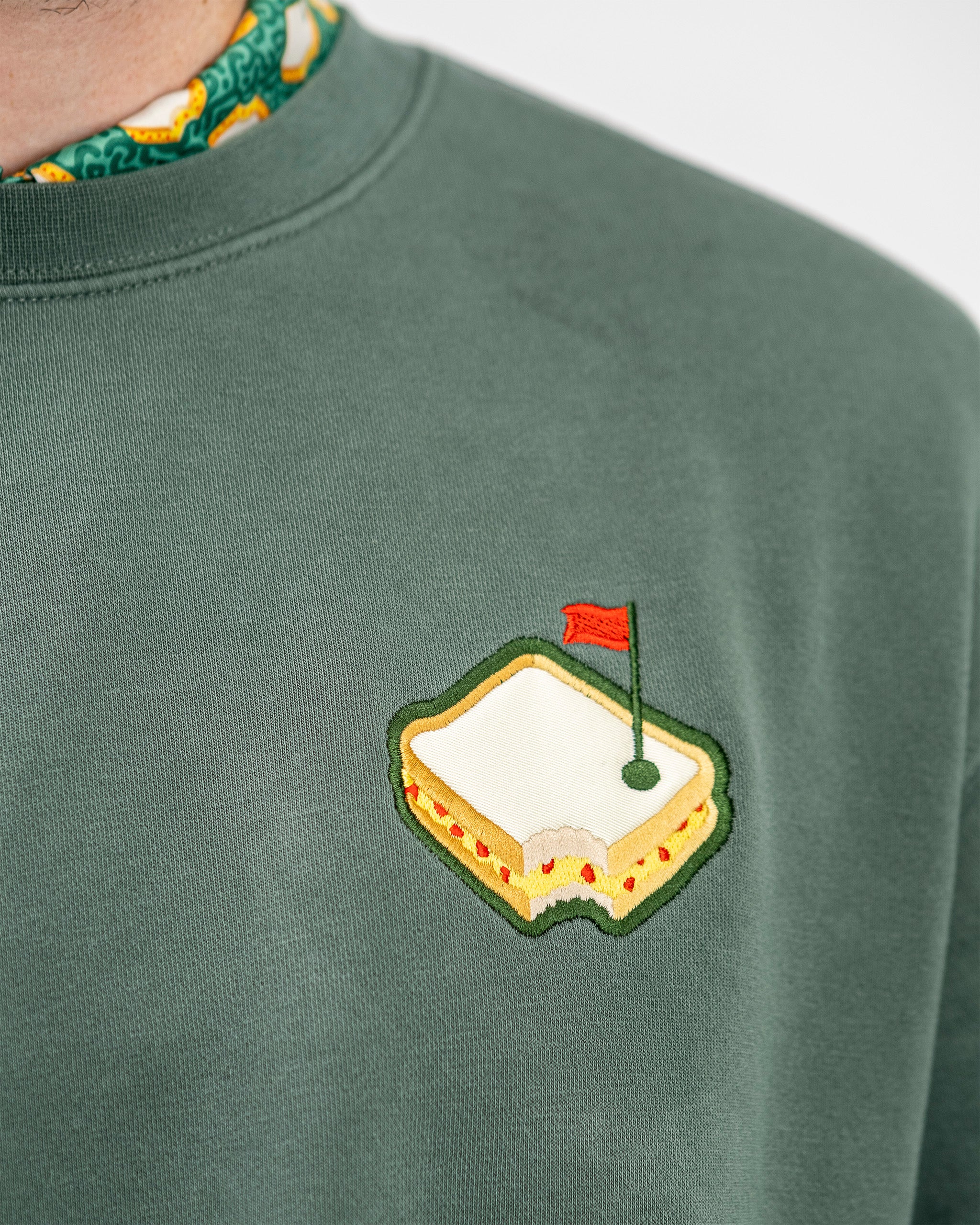 Olive green waffle knit pullover with a quarter zip and logo, perfect for stylish comfort on the golf course.