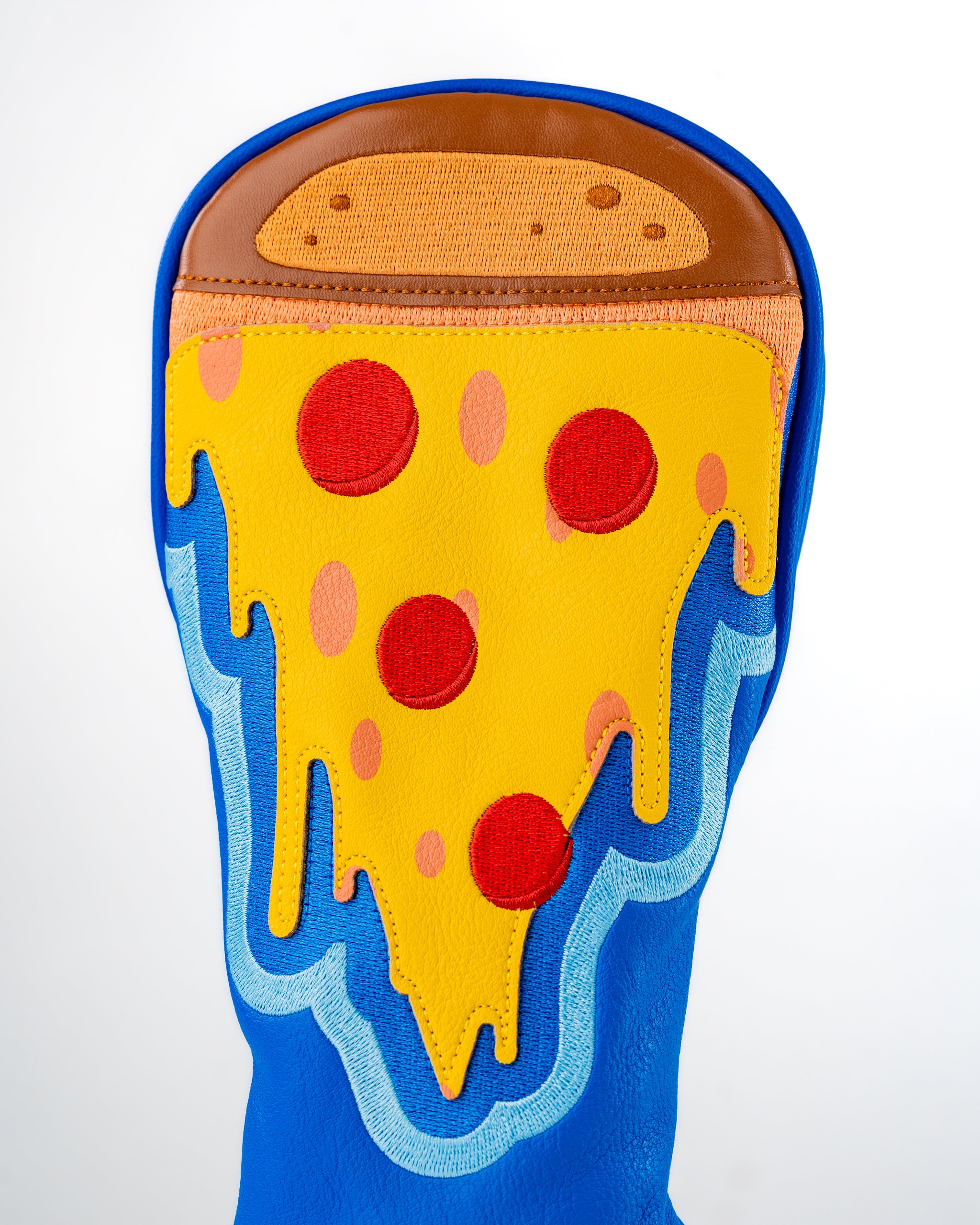 Colorful pizza-themed fairway cover featuring dripping cheese and pepperoni, designed for golfers who want to stand out.