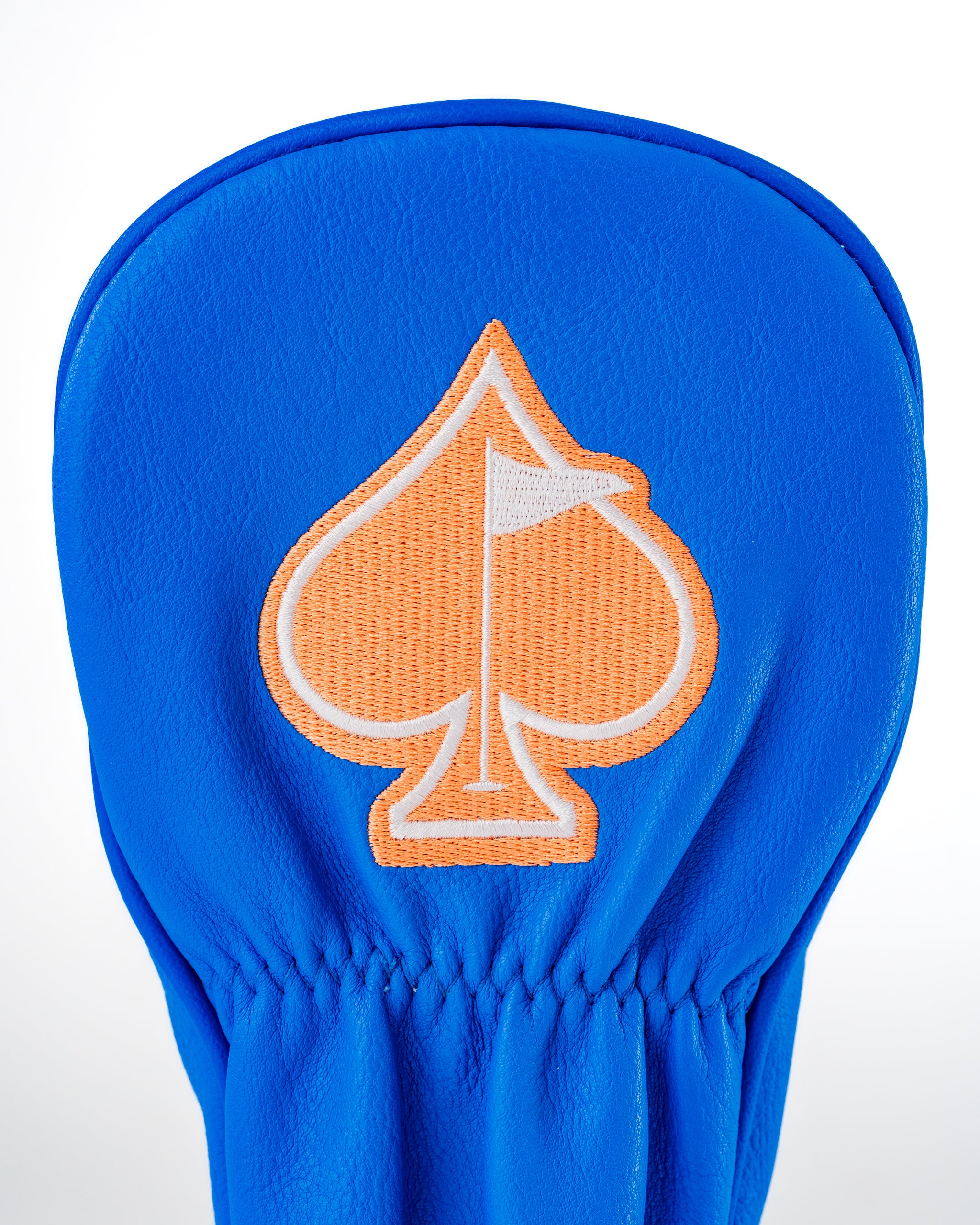 Bright blue golf headcover featuring an orange spade logo with a flag, designed for a fun and unique style on the course.