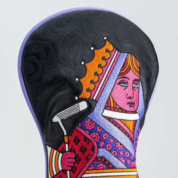 Colorful Queen of Spades fairway cover featuring intricate embroidery and a unique design for stylish golf protection.