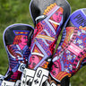 Colorful embroidered golf headcover featuring a bold, artistic queen with a golf club, vibrant pinks, purples, and orange ...
