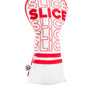 Bold white driver cover featuring repeated red "SLICE" text, designed for golfers who want to make a statement on the course.