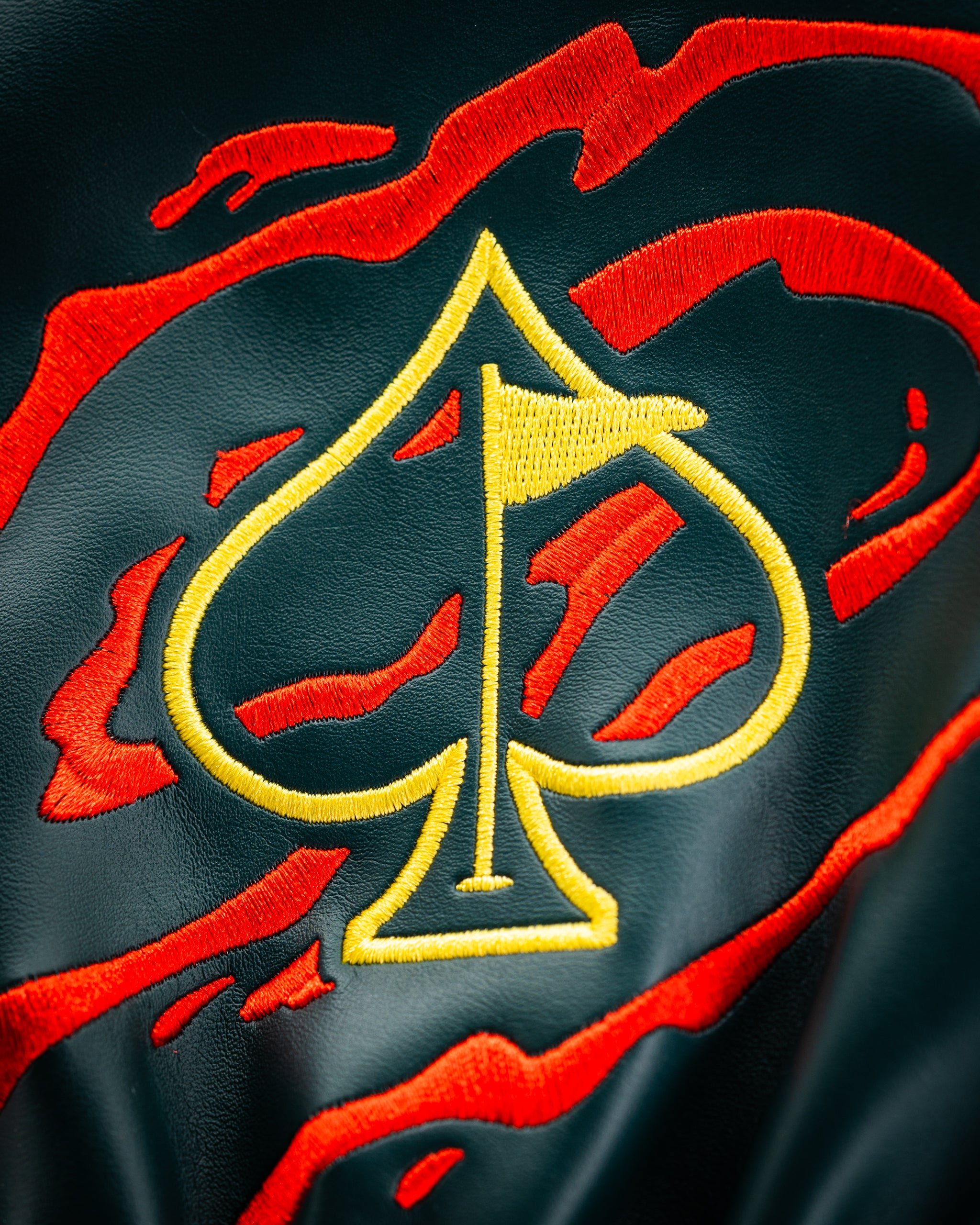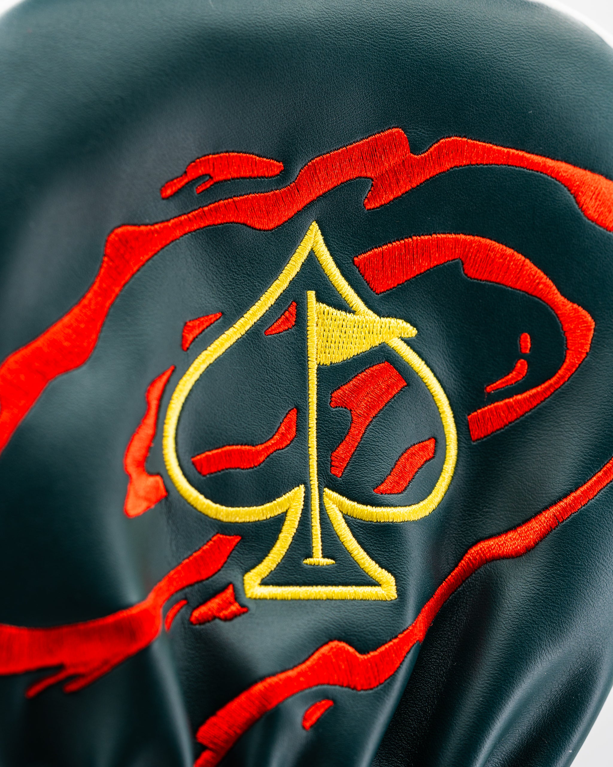 Bold black golf headcover with red and yellow embroidered spade and skull design, perfect for standout golf style. Bold black golf headcover with red and yellow embroidered spade and skull design, perfect for standout golf style.
