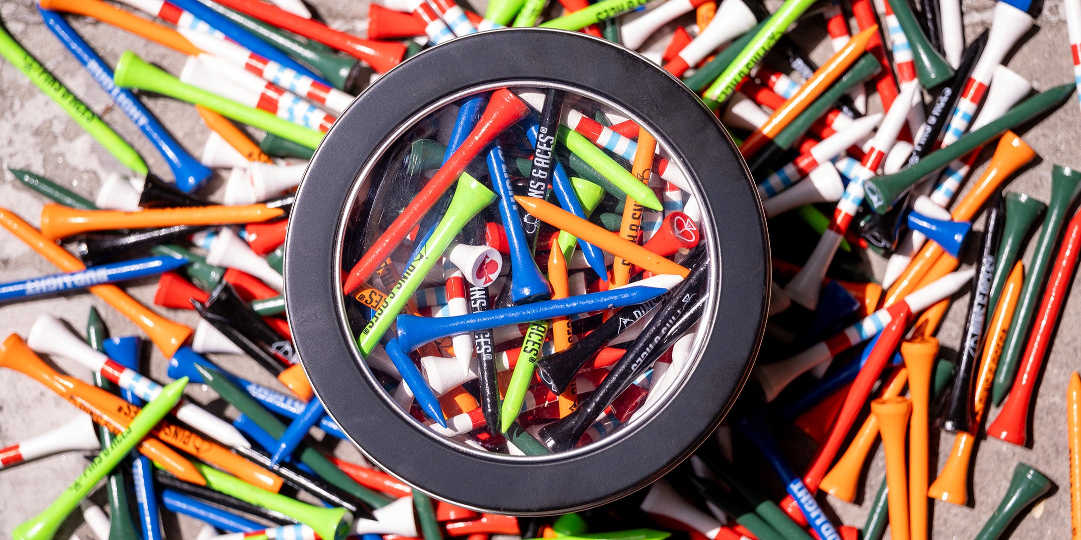 A round tin of colorful golf tees featuring various designs, labeled with the Pins and Aces brand.