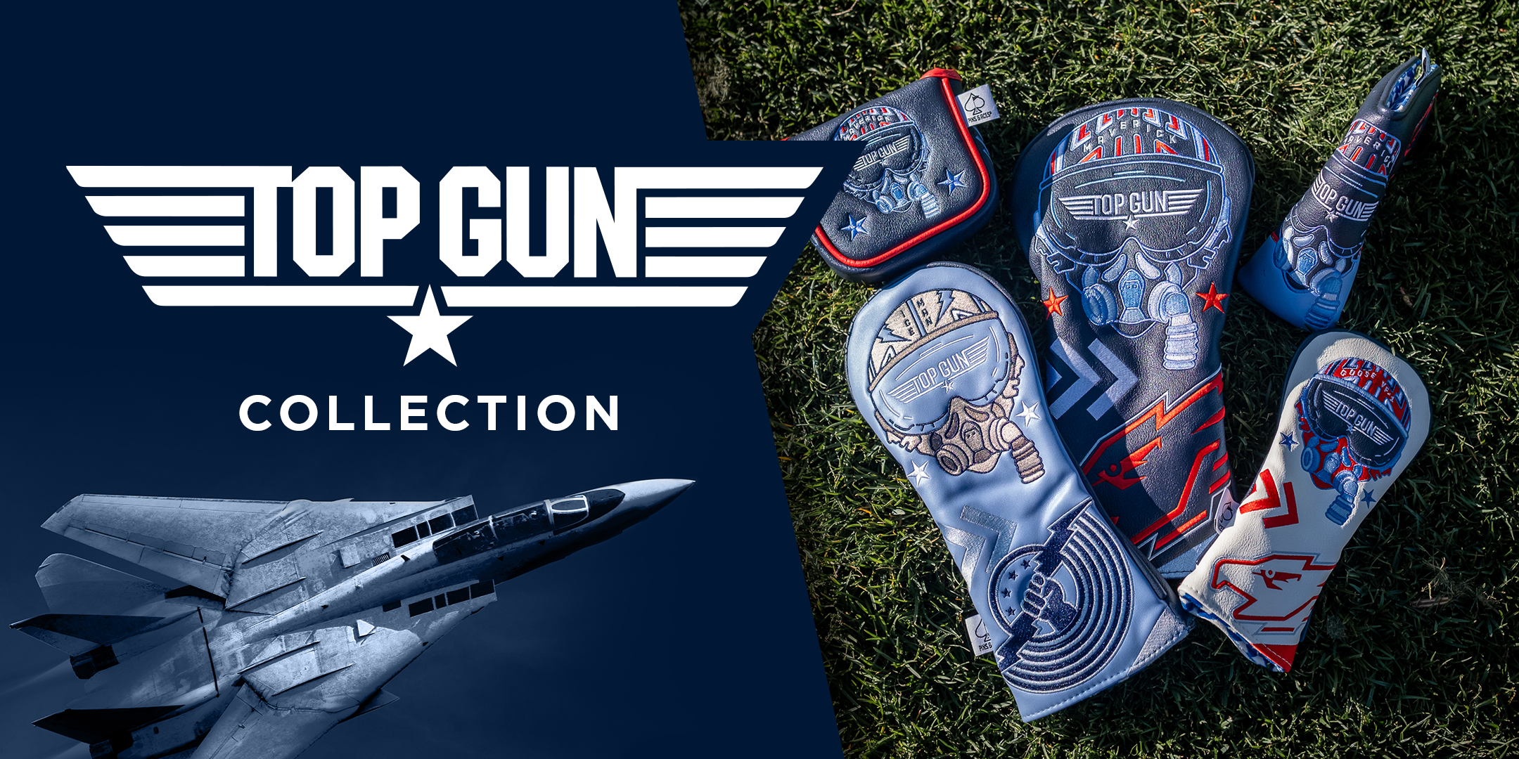 Set of Top Gun themed golf headcovers featuring a pilot helmet design with goggles, in black, blue, and white colors.