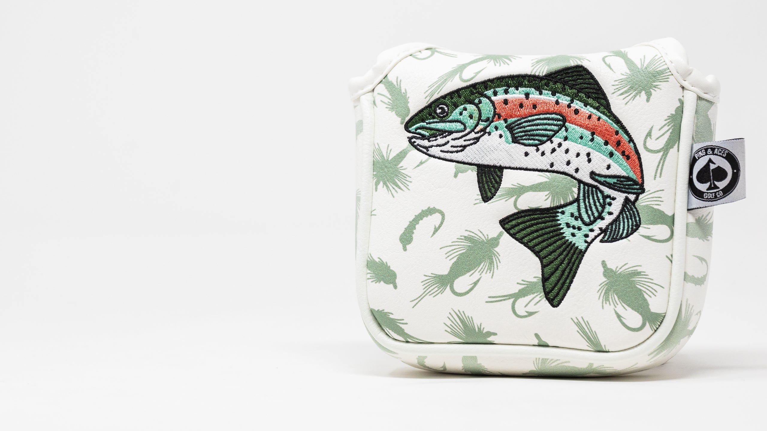 Trout mallet putter cover featuring a detailed fish design on a white background with green accents.