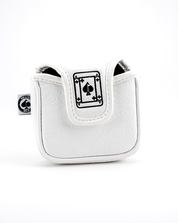 White mallet putter cover featuring an embossed design and Ace of Spades motif, perfect for stylish golfers.