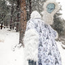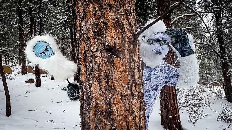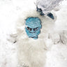 Snowy forest scene with person in a white, patterned golf robe and a monster headcover featuring a blue face and fluffy wh...