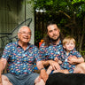 Three people wearing bold, colorful dinosaur-patterned shirts sitting outdoors among greenery, with golf accessories visible. Three people wearing bold, colorful dinosaur-patterned shirts sitting outdoors among greenery, with golf accessories visible.