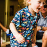 A young boy joyfully running in a colorful Jurassic-themed polo shirt featuring dinosaurs and tropical designs.