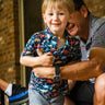 A young boy smiles while wearing a colorful Jurassic-themed polo shirt featuring dinosaur prints, standing beside an adult.